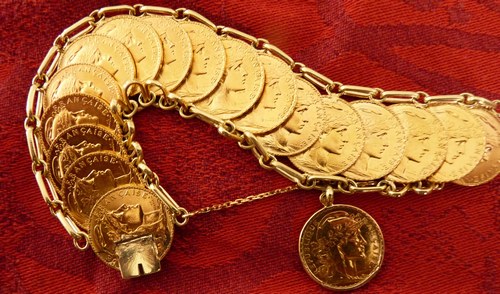 Beaucoup plus spectaculaire le collier ou le bracelet en or massif , composé de plusieurs pièces serties les unes aux autres, composé très souvent par des 20 francs or coq, Napoleon III, Génie ou Cérès. Ces bijoux sont rares et chers ce qui s’explique par la confection et bien sur le poids total de la matière.