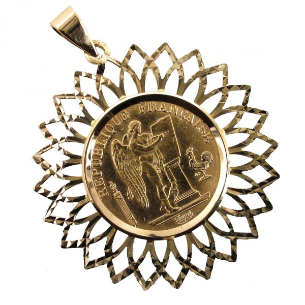 Qu'il soit en or ou en argent le pendentif reste très apprécié pendant la période d'après guerre. La pièce de monnaie sertie comme le 20 francs or coq ou Napoleon III généralement porté par les dames au milieu du vingtième siècles.
